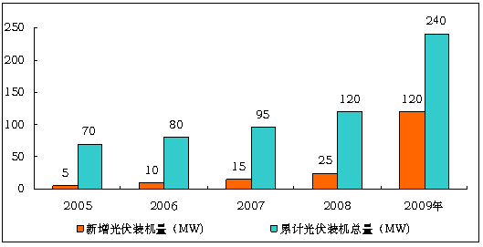 2009年在一系列津贴政策的推动下,我国光伏装机取得爆发式增添,2009年新增光伏装机量达120MW,这一数字和已往历年累计装置量相同。现在,中国光伏发电市场主要集中在通讯和工业应用、农村和边远地区应用、光伏并网发电系统和太阳能商品等领域。