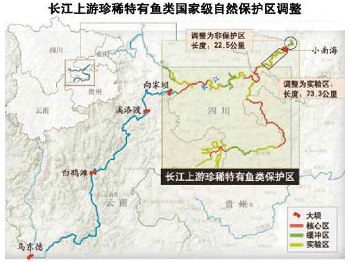 ¡¡¡¡2005Äê4Ô£¬¹úÎñÔºÕýʽÅú×¼ËÄ´¨Ê¡Ìá½»µÄ¡¶¹ØÓÚ³¤½ºÏ½¡ªÀײ¨¶ÎÕäÏ¡ÓãÀà¹ú¼Ò¼¶×ÔÈ»±£»¤Çø¹æÄ£¹¦Ð§Çøµ÷½â¼°¸ü¸üÃû³ÆµÄÌֽ̡·£¬½«¸Ã±£»¤Çø¸üÃûΪ¡°³¤½ÉÏÓÎÕäÏ¡¡¢ÌØÓÐÓãÀà¹ú¼Ò¼¶×ÔÈ»±£»¤Çø¡±¡£Õâ´Î±»³ÆÎª¡°ÆþÍ·¡±µÄµ÷½âʹµÃ±£»¤Çø±»Çи¸ÉÁ÷½¶ÎÓÉÔÀ´µÄ443.41¹«ÀïËõ¼õΪ353.16¹«Àï¡£¸ÃÐж¯±»ÓßÂÛÒÔΪÊÇ¡°ÎªÏªÂå¶É¡¢Ïò¼Ò°ÓË®µçÕ¾½¨ÉèÈ÷¡±¡£